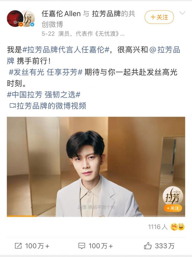 趁著劇集播出的熱度,拉芳火速邀請(qǐng)主演任嘉倫拍攝廣告,并在5月22日官宣任嘉倫為拉芳品牌代言人,這一操作成功讓觀眾聯(lián)想到“毛躁的黑長(zhǎng)直頭發(fā),有拉芳來(lái)救”的品牌印象。