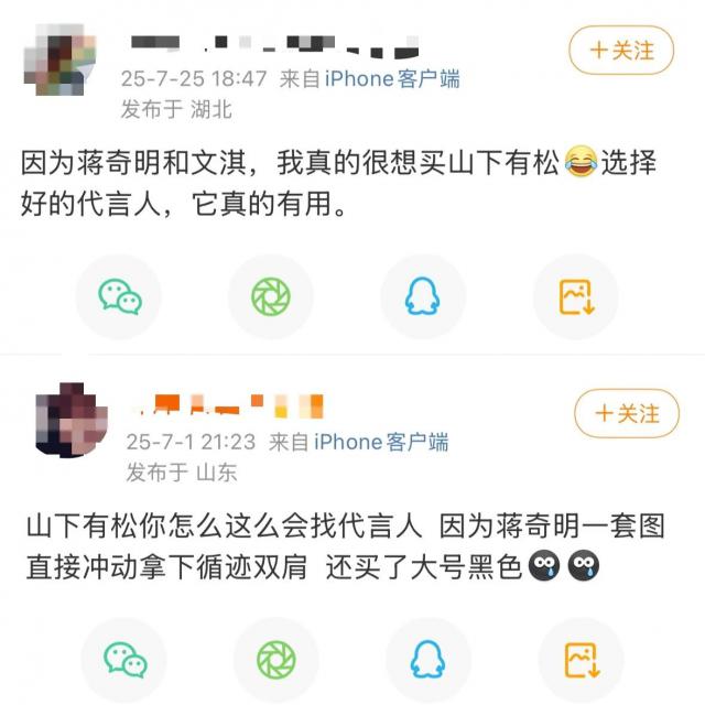 在影視圈不同領(lǐng)域活躍的代言人,也吸引了不同的粉絲受眾,讓不少網(wǎng)友發(fā)博感嘆:“代言人太會(huì)選”“因?yàn)槭Y奇明和文琪,真的很想買山下有松?!?/p>