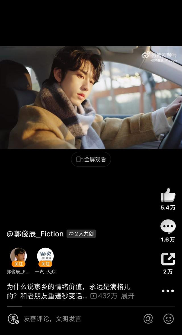 就像一汽 - 大眾選擇長(zhǎng)春籍演員郭俊辰,不僅看重他作為新生代偶像的影響力,更看重其個(gè)人經(jīng)歷與品牌地域文化的高度契合。在春節(jié)之際,#偶遇郭俊辰回老家#話題登上熱搜,剛拿到駕照的郭俊辰,駕駛著家鄉(xiāng)品牌的車返回長(zhǎng)春,傳遞“選擇一汽大眾一起回家團(tuán)圓”的情感主題。