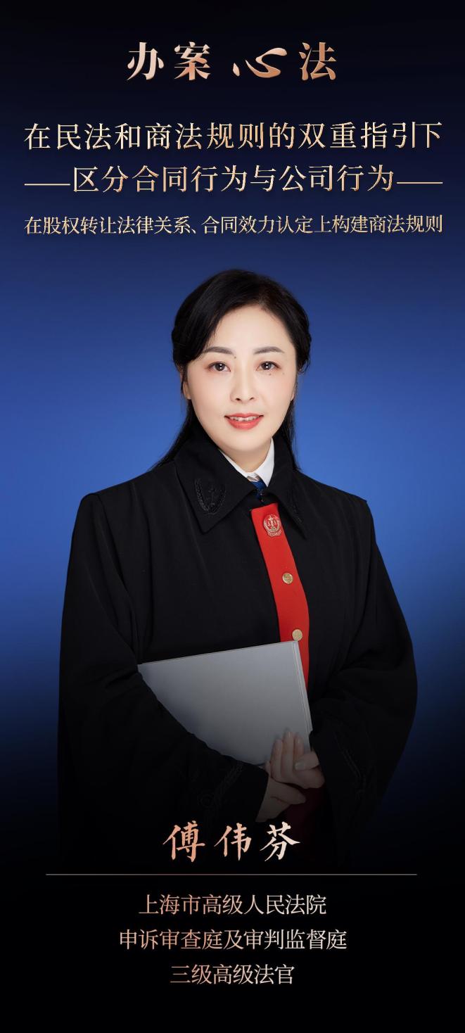 傅偉芬,華東政法大學(xué)民商法學(xué)碩士,現(xiàn)任上海市高級(jí)人民法院申訴審查及審判監(jiān)督庭三級(jí)高級(jí)法官,同時(shí)擔(dān)任華東政法大學(xué)兼職碩士生導(dǎo)師。她榮獲上海法院審判業(yè)務(wù)骨干、辦案標(biāo)兵、辦案能手、調(diào)研先進(jìn)個(gè)人等稱號(hào),入選上海法院首批實(shí)務(wù)專家,多次立功受獎(jiǎng)。她主審的全國(guó)首例上市公司兼并重組股份隱名代持案,獲全國(guó)法院系統(tǒng)優(yōu)秀案例分析二等獎(jiǎng);有多起案件入選上海法院參考案例、精品案例、優(yōu)秀裁判文書、示范庭審等。她連續(xù)14年負(fù)責(zé)上海法院黨組課題、上海法院重點(diǎn)及報(bào)批課題,參與多個(gè)國(guó)家社科基金課題并獲評(píng)優(yōu)秀課題,主要研究領(lǐng)域涵蓋民法、商法、公司法、仲裁、破產(chǎn);10余篇論文獲全國(guó)級(jí)征文一等獎(jiǎng)等獎(jiǎng)項(xiàng),在《人民司法》《法律適用》等刊物發(fā)表論文30余篇。