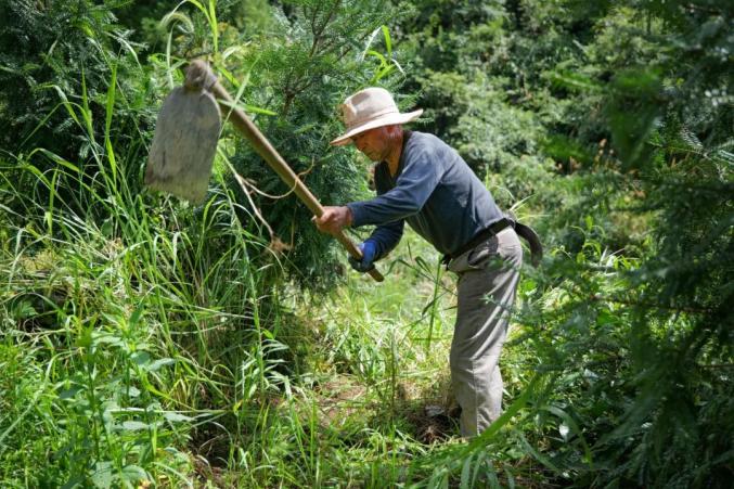 基地里,村民們正在進(jìn)行人工除草。每年7月中旬至9月中旬,這里會(huì)通過(guò)除草還田來(lái)疏松土質(zhì)、增強(qiáng)土壤肥力?;剡€采用嫁接技術(shù)培育優(yōu)質(zhì)苗木。經(jīng)過(guò)7年精心培育,基地已種下1.2萬(wàn)棵香榧樹(shù),其中4千余棵大樹(shù)進(jìn)入穩(wěn)定掛果期。