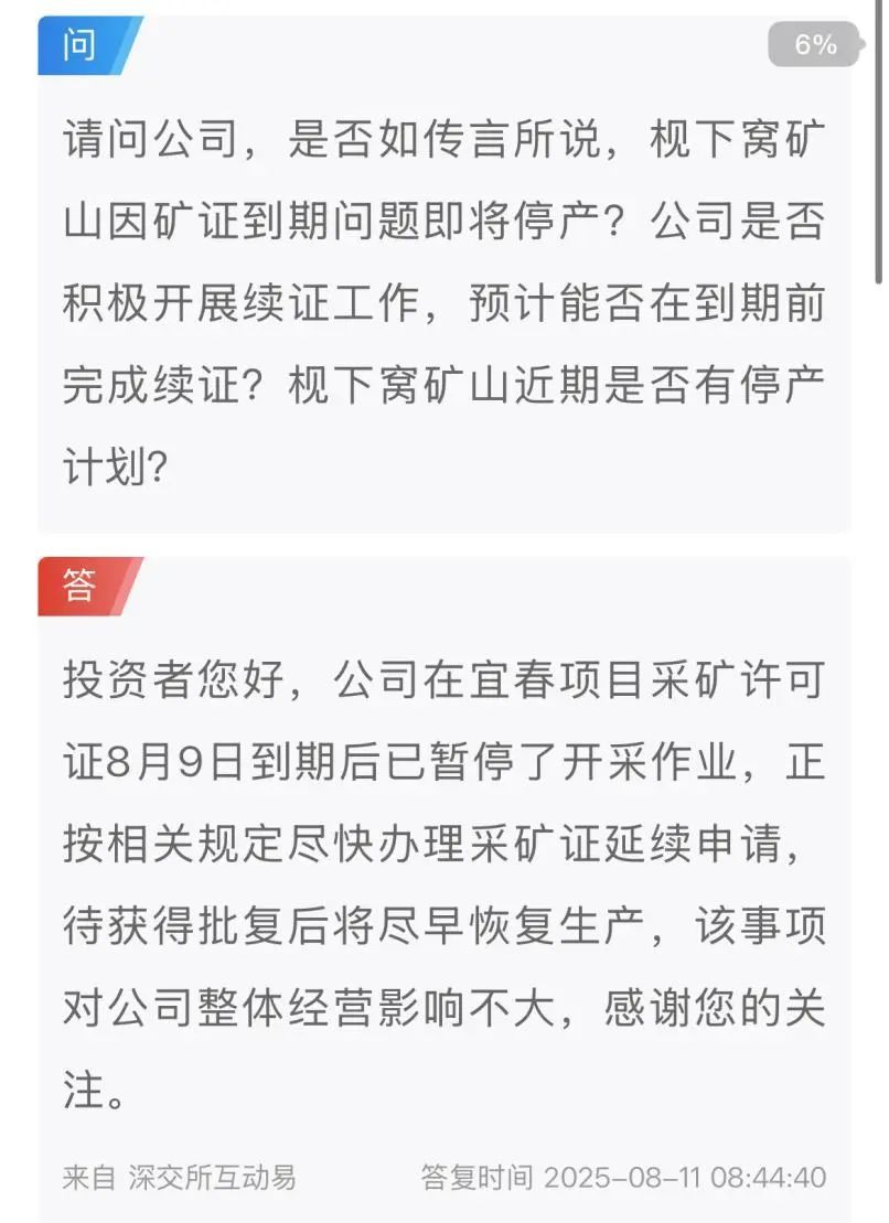 8月11日上午,寧德時代在互動平臺正式回應(yīng),公司在宜春項(xiàng)目的采礦許可證于8月9日到期后,確實(shí)暫停了開采作業(yè)。