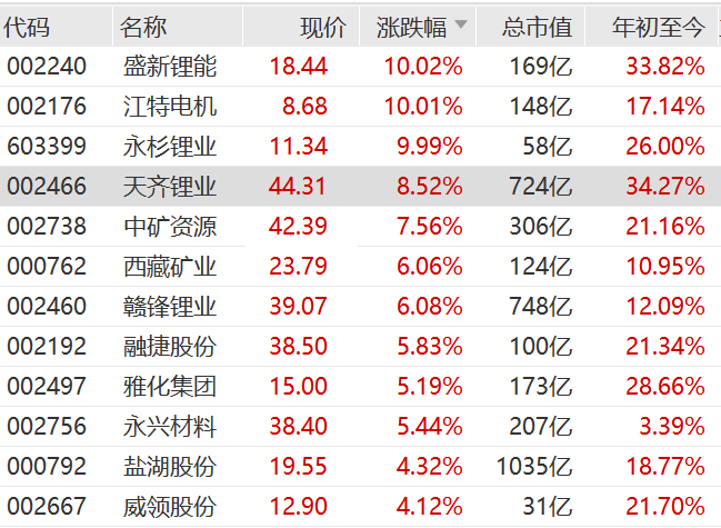 盛新鋰能、天齊鋰業(yè)漲幅超8%,中礦資源漲幅超7%,威領(lǐng)股份、融捷股份、永興材料、贛鋒鋰業(yè)等也隨之上漲。