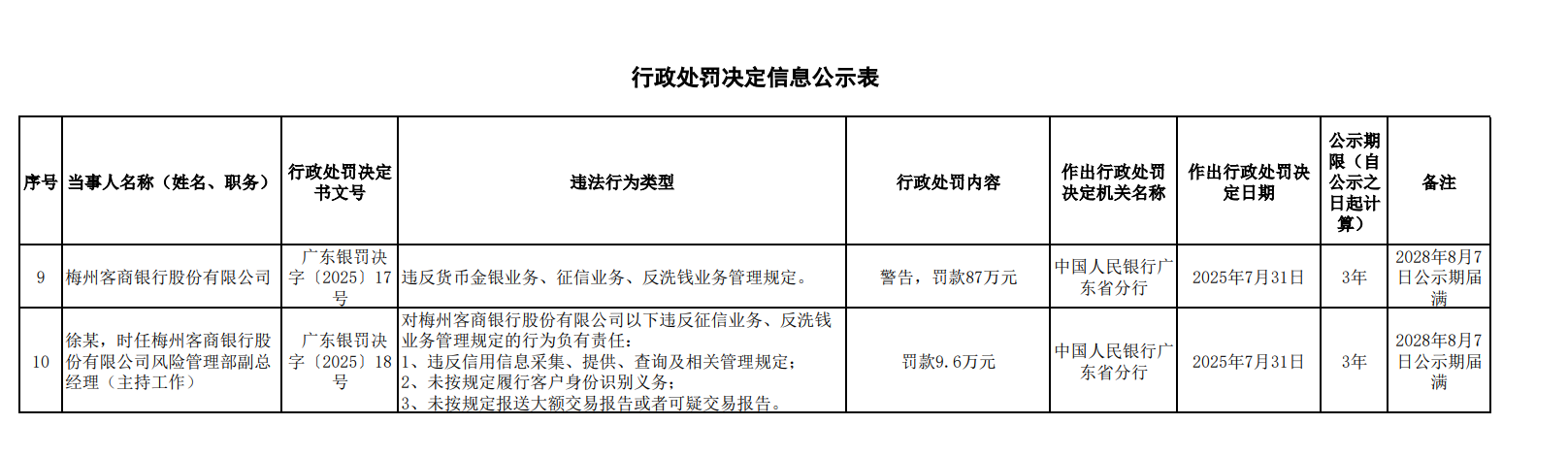 銀行財眼丨廣東梅州客商銀行因違規(guī)被罰款87萬元