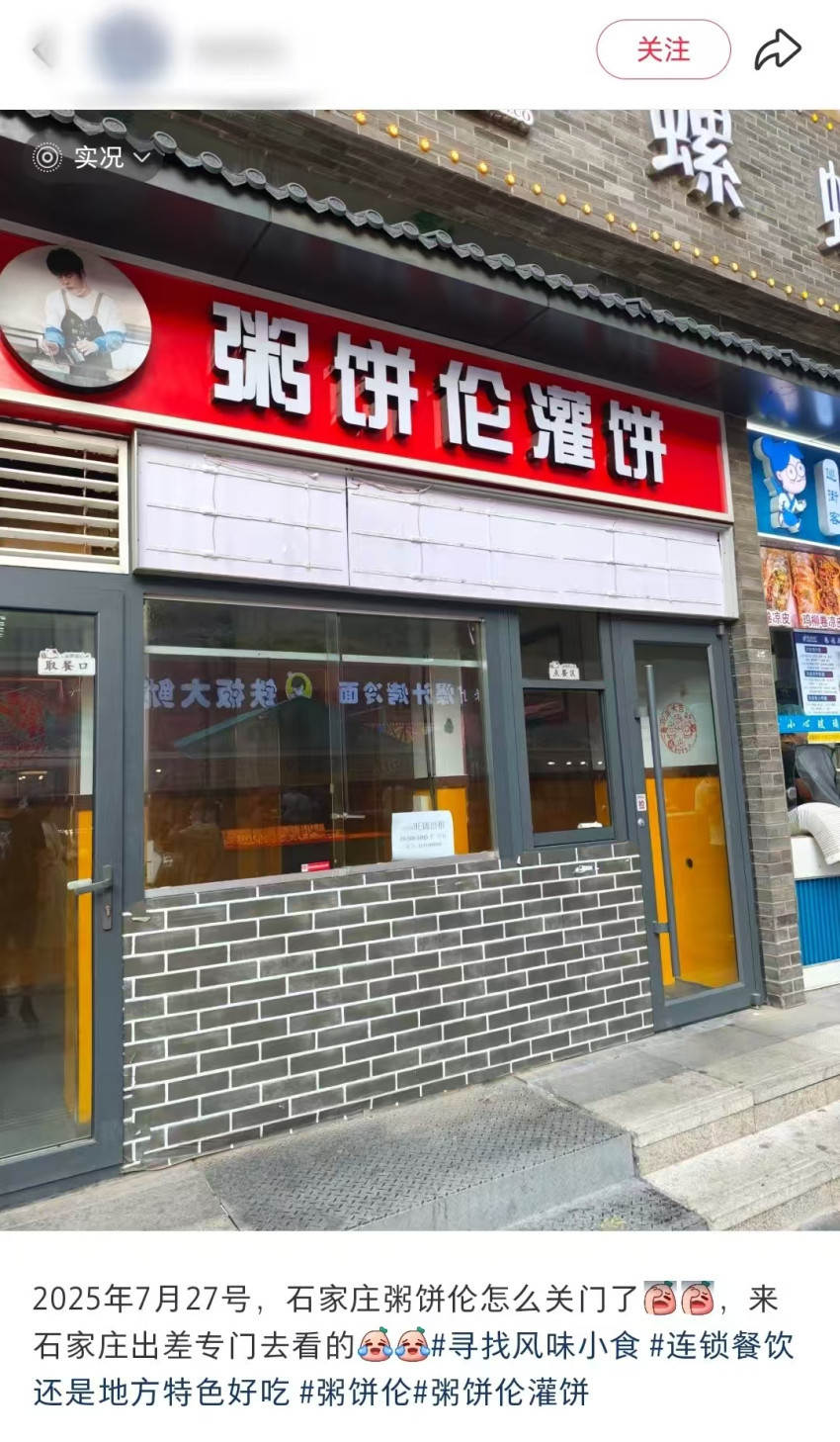 據華商網報道,今年1月,“粥餅倫雞蛋灌餅”石家莊新店在灣里廟步行街開業(yè)。開業(yè)當天,“粥餅倫”親自到場宣傳新店,不僅與特意前來的粉絲互動合影,還在現場為消費者服務,場面十分熱鬧。然而,據海報新聞報道,7月27日,有游客前往門店打卡時,發(fā)現該店已關門停業(yè)。隔壁店鋪工作人員透露,門店已關停數日。