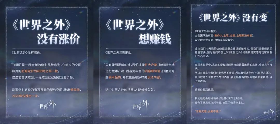 7月29日,輿論危機全面爆發(fā)。冷處理無效、流水暴跌,《世界之外》連續(xù)發(fā)出“沒有漲價”“想賺錢”“沒有變”三篇公告,這一套操作直接把玩家弄懵了。