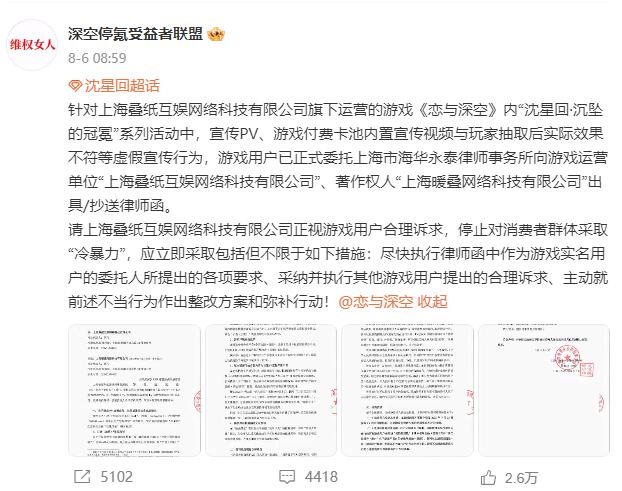 疊紙的沉默激怒了玩家,維權(quán)行動愈演愈烈。8月6日,“深空停氪受益者聯(lián)盟”委托律師事務(wù)所出具律師函。