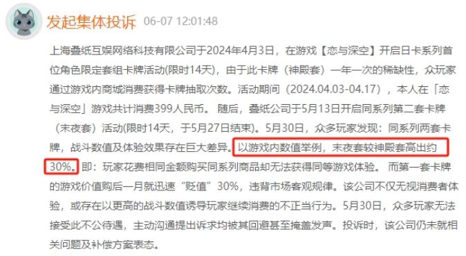 先是網(wǎng)易的《世界之外》被玩家吐槽在游戲內(nèi)暗自修改定價,接著疊紙的《戀與深空》被指控沈星回日卡實機效果與PV演示不符,乙游玩家集體“起義”,要求游戲廠商給出解釋和解決方案。