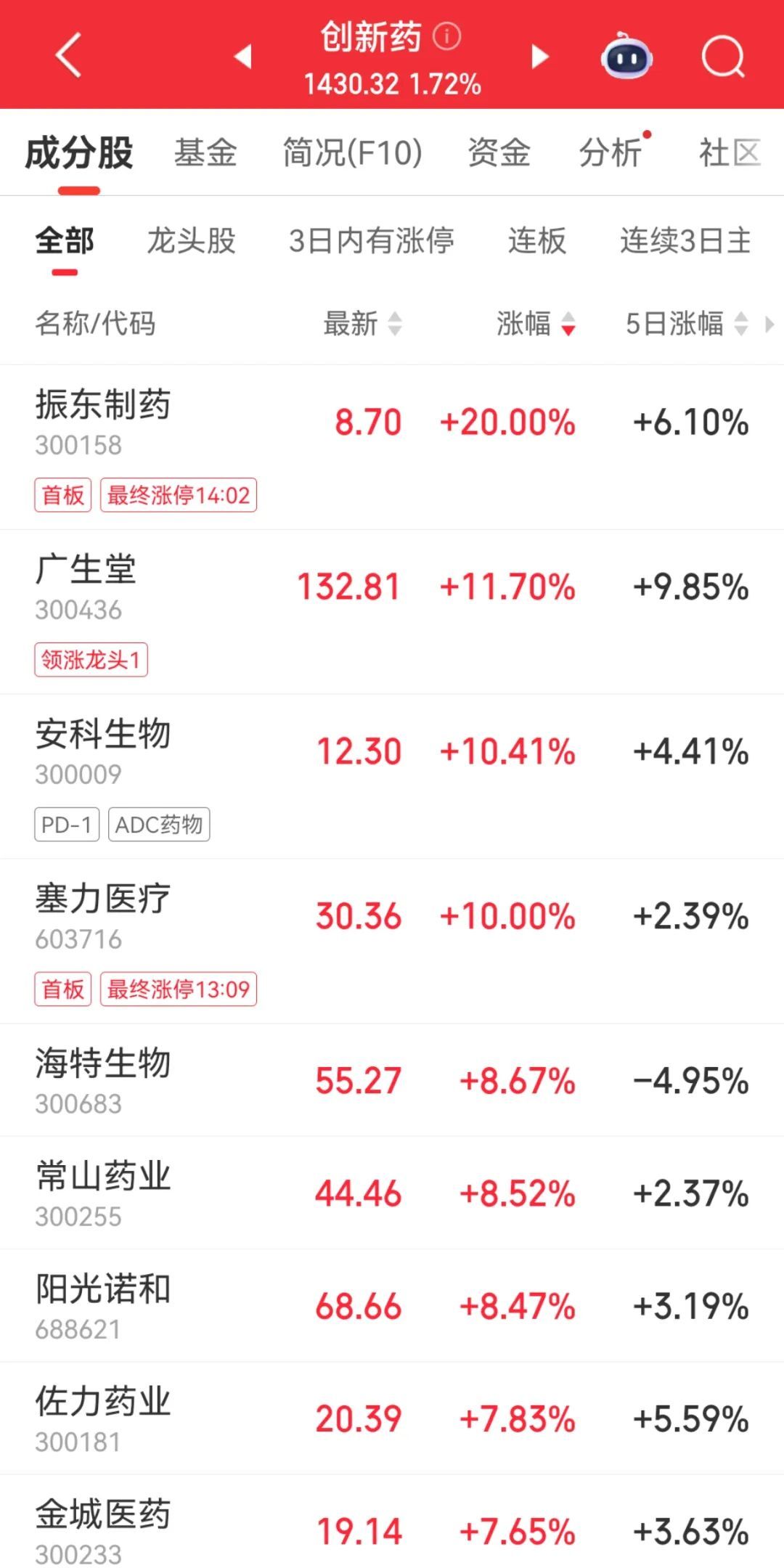 今日,A股創(chuàng)新藥概念表現(xiàn)強勢,振東制藥、塞力醫(yī)療午后漲停。