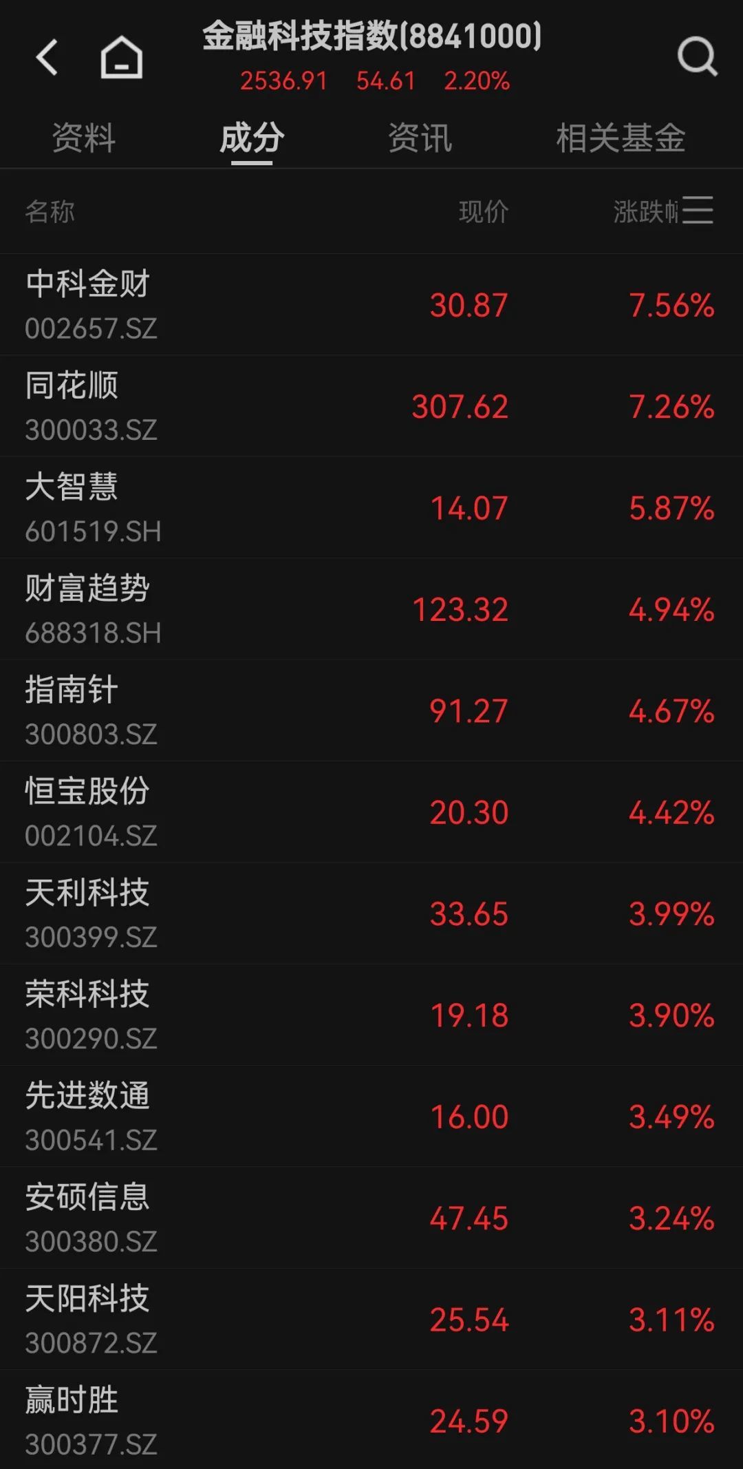 券商股中,國盛金控領(lǐng)漲,漲幅超過7%。金融科技方向上,中科金財、同花順、大智慧領(lǐng)漲,東方財富漲2.59%,成交額為110.44億元,位居A股市場第一。