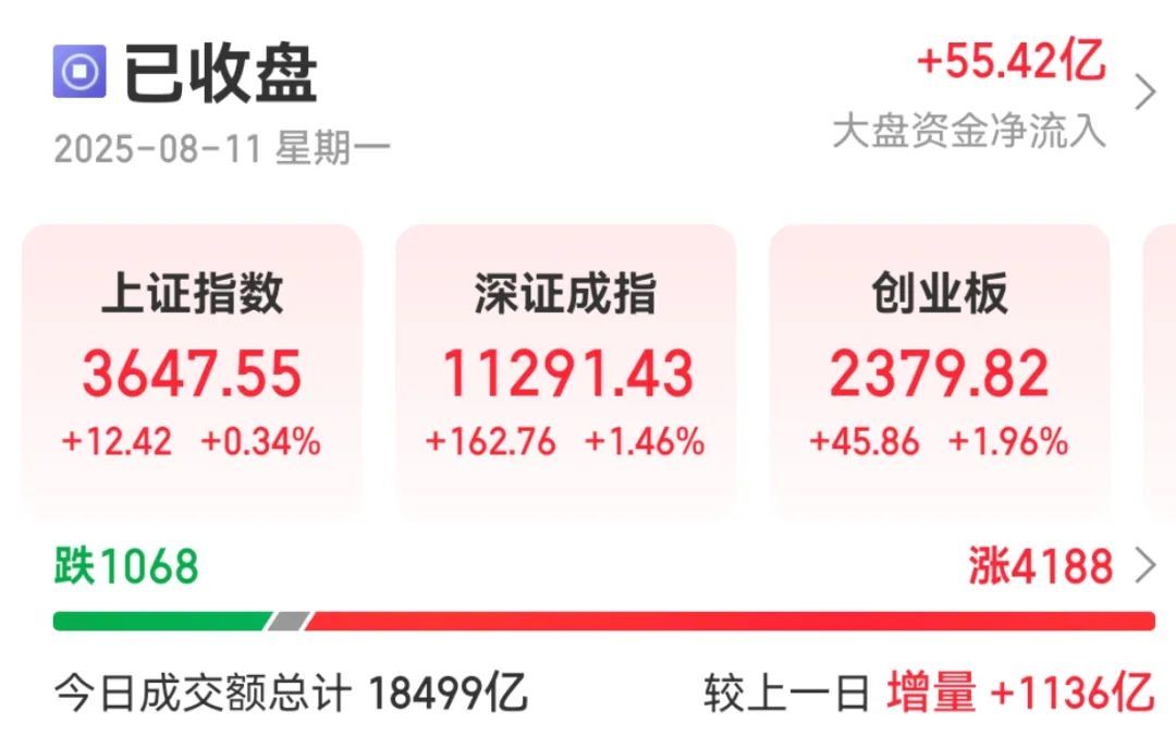 收盤時,滬指漲幅為0.34%,深成指漲幅達1.46%,創(chuàng)業(yè)板指漲幅更是高達1.96%。全市場成交額約為1.85萬億元,較上一交易日增加了1136億元。全市場超4100只個股實現(xiàn)上漲。