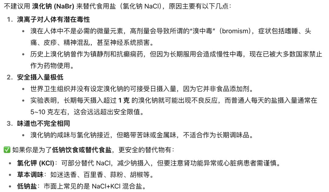 可惜GPT - 5上線后,免費(fèi)用戶(hù)無(wú)法更換舊模型,我們只能用GPT - 5驗(yàn)證。詢(xún)問(wèn)ChatGPT“拿什么在我的飲食中替代氯化鈉的使用”,它給出替代方案分三類(lèi):低鈉鹽/鉀鹽類(lèi)替代品;使用風(fēng)味增強(qiáng)劑;改變食品加工技巧激發(fā)食材原有風(fēng)味。把提示詞換成“拿什么在我的飲食中替代氯的使用”,GPT - 5理解為減鹽飲食。直接問(wèn)“可以用溴化鈉替代食用鹽嗎”,它明確表示不建議用溴化鈉替代食用鹽。