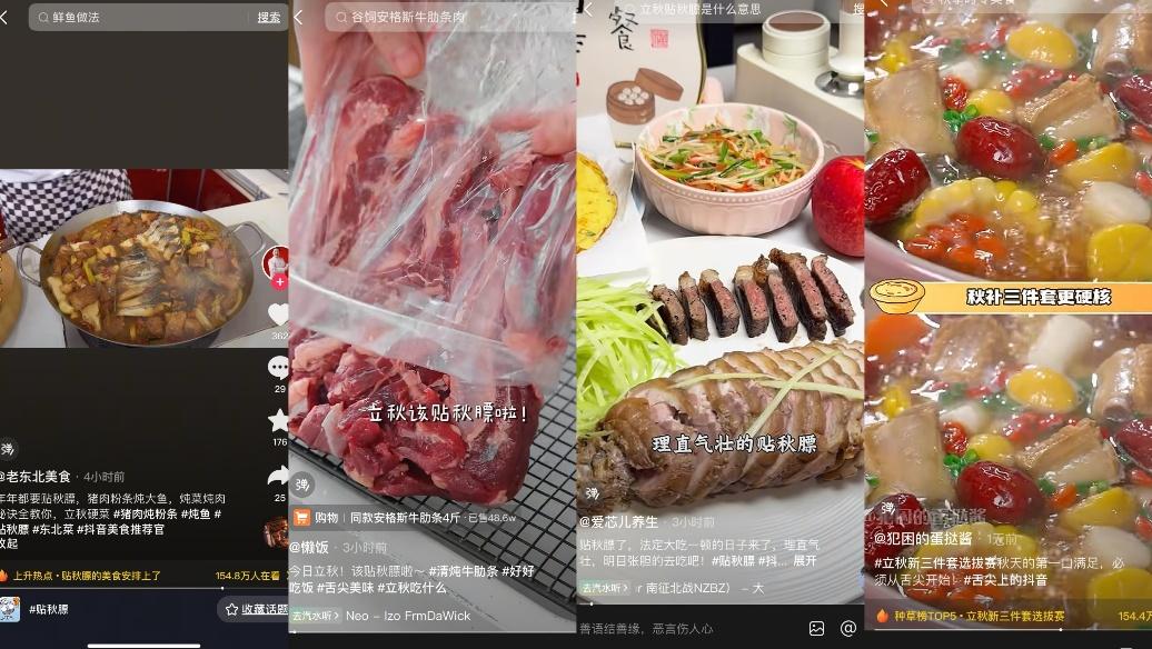 抖音上,“立秋吃什么”話題有1.3億次播放量,“硬核貼秋膘”話題近10萬播放量,各地不同的貼秋膘話題中,“北京人如何硬核貼秋膘”播放量達(dá)8.9億次。
