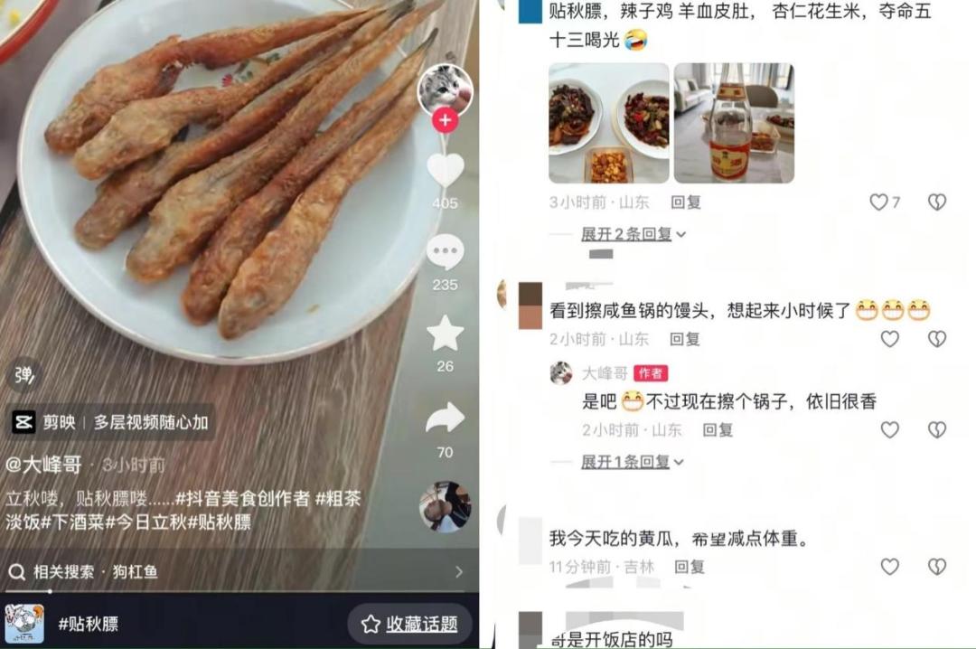立秋當(dāng)天,有美食創(chuàng)作者在抖音發(fā)“立秋嘍,貼秋膘嘍”的短視頻,“醬烹雞腿肉、蒜泥笨雞蛋、香腸午餐肉……先來杯茶,再來個(gè)酒,滿含深情敬朋友”,饞壞了不少網(wǎng)友,有人羨慕稱“這才叫過日子”,還有網(wǎng)友在評(píng)論區(qū)曬出自己的立秋首餐,辣子雞、涮羊肉、肉包子等琳瑯滿目。