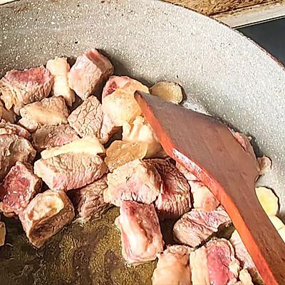 4、放入牛腩,加少許料酒,進(jìn)行煸炒。