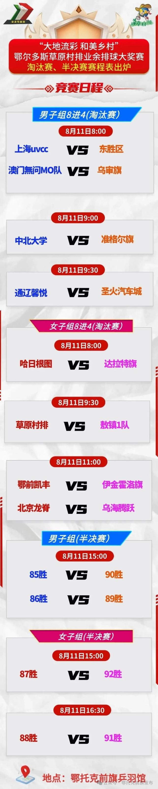 今天(8月11日),“大地流彩 和美鄉(xiāng)村”鄂爾多斯草原村排業(yè)余排球大獎(jiǎng)賽有新消息啦!男子組8進(jìn)4(淘汰賽、半決賽)以及女子組8進(jìn)4(淘汰賽、半決賽)的最新賽程表新鮮出爐!