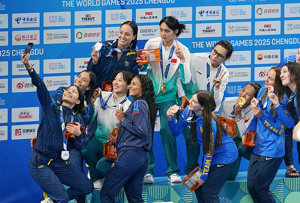 蹼泳沒有奧運會、世錦賽那樣的萬人追捧,運動員們在混采區(qū)甚至?xí)挥浾呓绣e名字。世界運動會是蹼泳選手們最接近世界舞臺中央的時刻。走下最高領(lǐng)獎臺的許藝川,眼里還帶著哭泣后的血絲。從2013年哥倫比亞卡利,到如今的成都,33歲的她是這支冠軍隊伍里的“四朝元老”。