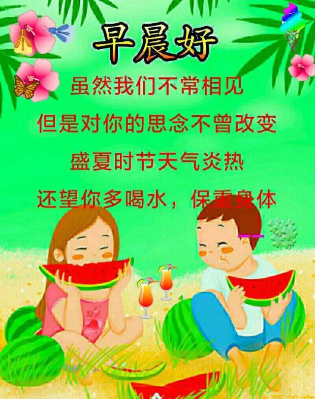 夏季防上火,千萬別熬夜。常喝白開水,每天睡午覺。多吃水果青菜,心情常常開懷。室內(nèi)要通風,出門要防曬。早睡早起,晨練強身健體。提醒父母,健康才是幸福!我的祝福也準時來到你身邊,只為送上美好祝愿。早上好!