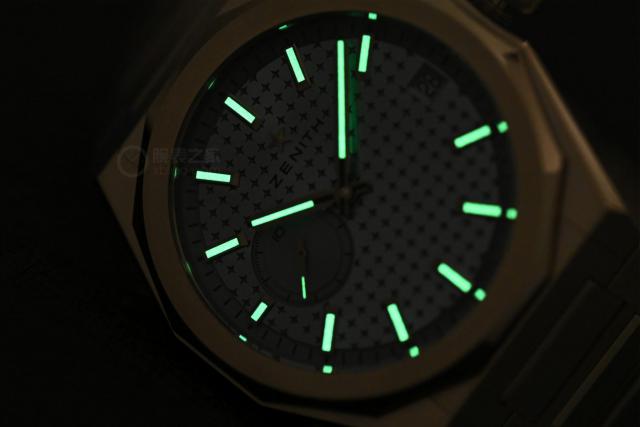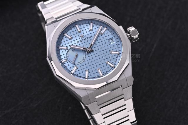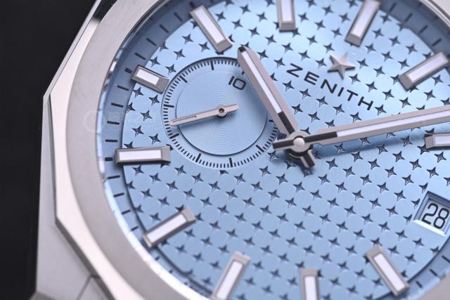 仔細(xì)看盤面,采用太陽飾紋,滿盤由四芒星圖案組成,巧妙致敬了真力時(shí)的品牌歷史。3時(shí)位置有同色日歷顯示窗,更好地融入表盤。9時(shí)是10秒計(jì)時(shí)盤,同樣為同色并采用唱片飾紋,細(xì)節(jié)精致,整體排布對(duì)稱。冰藍(lán)配色清爽又耐看,防水可達(dá)100米深度,日常使用足夠。