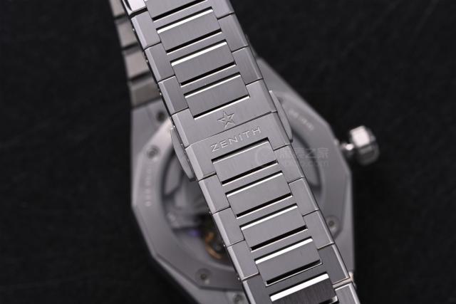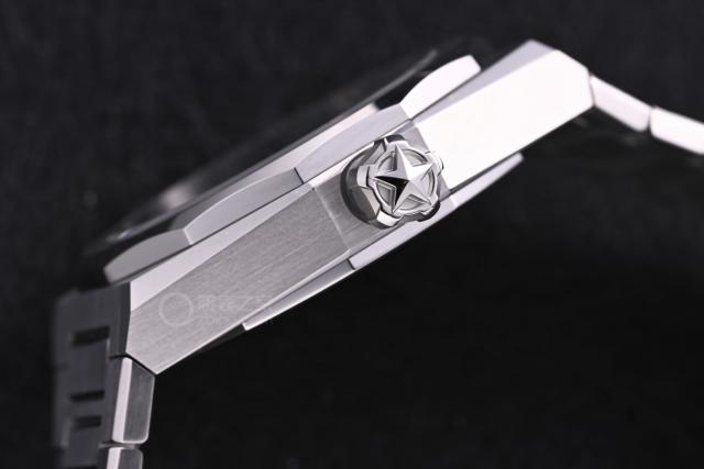 表冠頂部鑲刻著立體的真力時(shí)經(jīng)典五角星標(biāo)志,表側(cè)拉絲細(xì)膩,質(zhì)感十足。