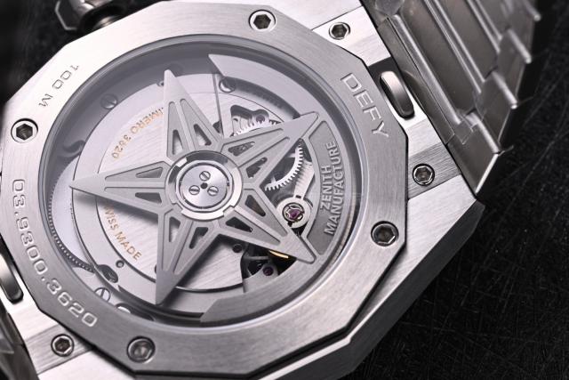 這只腕表搭載真力時(shí)自產(chǎn)的El Primero 3620自動(dòng)機(jī)械機(jī)芯,每小時(shí)振蕩36000次,動(dòng)力儲(chǔ)備達(dá)60小時(shí)。機(jī)芯配有停秒裝置,調(diào)時(shí)更方便。真力時(shí)經(jīng)典的1/10秒計(jì)時(shí)功能,是復(fù)雜制表工藝之一,通過擒縱直接驅(qū)動(dòng),這枚機(jī)芯相當(dāng)出色。