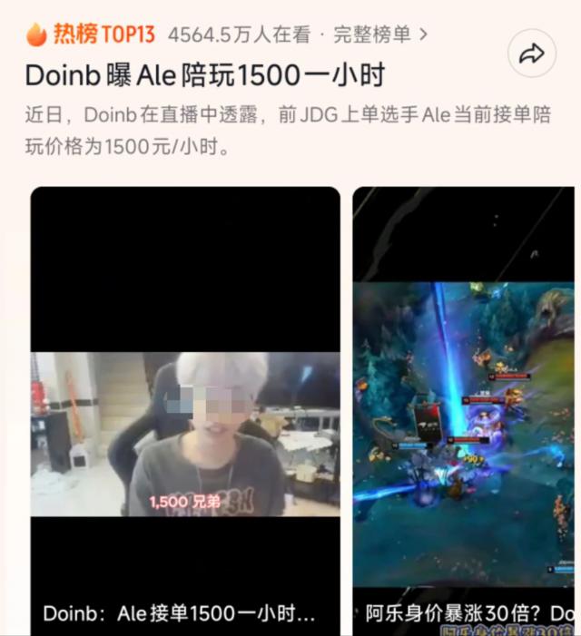 在一段被網(wǎng)友瘋轉(zhuǎn)的直播切片短視頻里,知名電競(jìng)選手Doinb透露:“阿樂現(xiàn)在接單賺麻了呀,他一小時(shí)(陪玩)多少錢?1500(元)......”