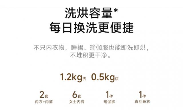 既然尺寸有別,洗烘容量自然也不同。官方數(shù)據(jù)顯示,其洗滌容量為 1.2kg,烘干容量為 0.5kg,而常規(guī)洗烘一體機(jī)一般是 10kg 洗滌搭配 7kg 烘干。