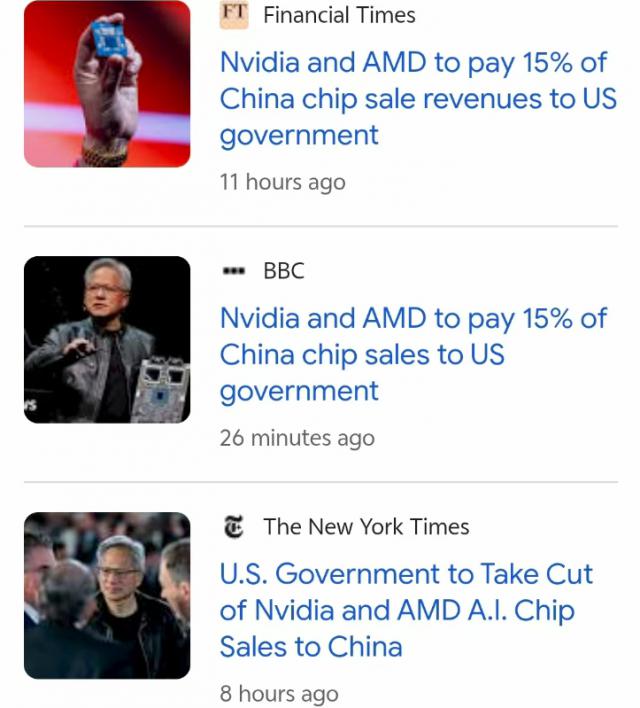 據(jù)多家歐美主要媒體披露,美國(guó)政府會(huì)從英偉達(dá)和AMD這兩家美國(guó)芯片企業(yè)賣給中國(guó)的人工智能芯片銷售利潤(rùn)中,抽取15%。