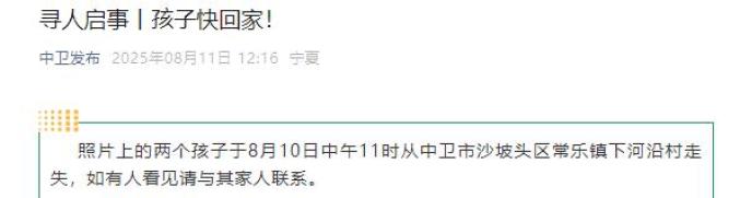 8月11日中午,公眾號(hào)“中衛(wèi)發(fā)布”發(fā)布了一則尋人啟事,稱(chēng)兩名兒童于8月10日中午11時(shí)在中衛(wèi)市沙坡頭區(qū)常樂(lè)鎮(zhèn)下河沿村走失。