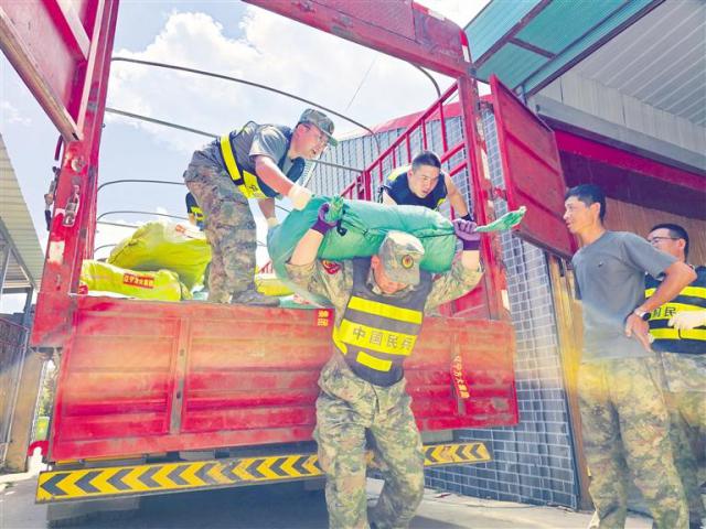榆中民兵連的民兵往庫(kù)房搬運(yùn)救援物資