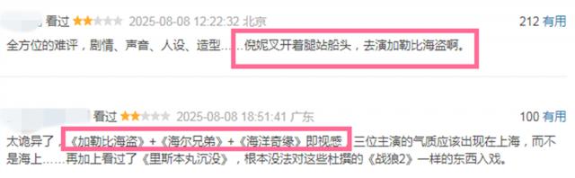 大營救的鏡頭也很混亂,大家穿著類似比基尼的衣服出海,倪妮飾演的阿花叉開腿站在船頭,有人爬上桅桿吼叫,被調(diào)侃像去演“加勒比海盜”。