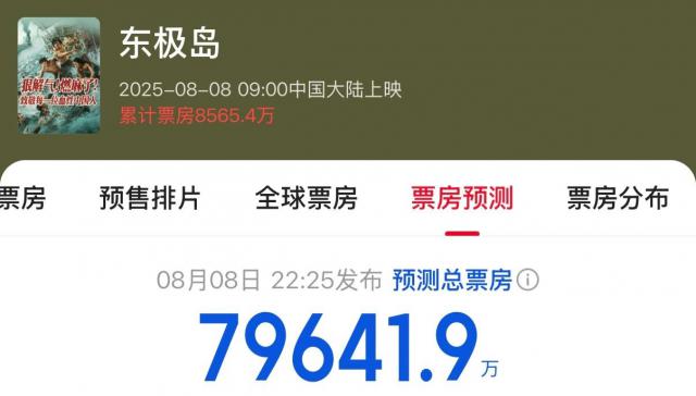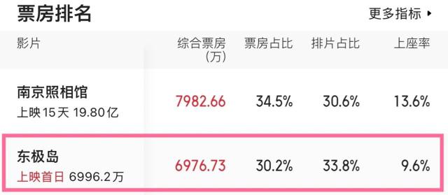 8 月 8 日上映首日,《東極島》排片第一,但不到 7 千萬的首日票房輸給了已上映兩周、排片不如它的愛國題材電影《南京照相館》,差距達(dá) 1 千萬。