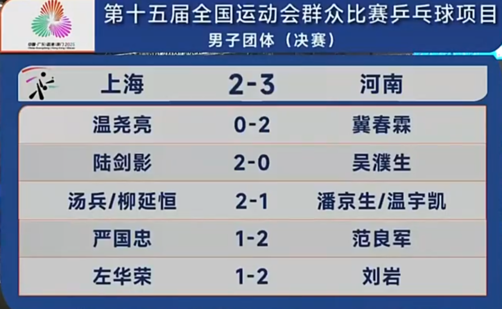 北京時(shí)間8月11日,第十五屆全運(yùn)會(huì)群眾比賽乒乓球項(xiàng)目男子團(tuán)體決賽,上海市統(tǒng)義集團(tuán)以2比3不敵河南,收獲亞軍。