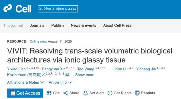 相關(guān)研究成果于北京時(shí)間8月11日晚,以《VIVIT:通過(guò)離子玻璃態(tài)組織揭示跨尺度生物結(jié)構(gòu)》(VIVIT: Resolving trans - scale volumetric biological architectures via ionic glassy tissue)為題,在線發(fā)表于《細(xì)胞》(Cell)。