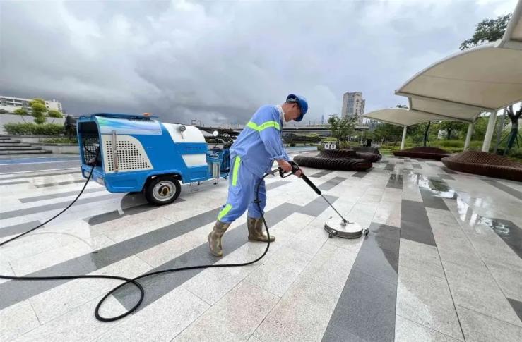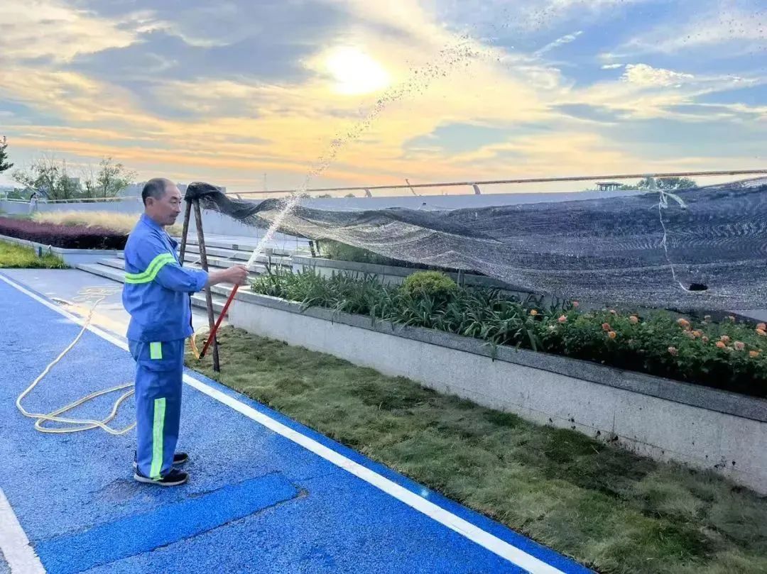 為應(yīng)對夏季高溫,凈南環(huán)境公司開啟‘高溫守護模式’,采取分段作業(yè)。這樣既保證了道路、廢物箱、座椅等區(qū)域的精細保潔,又保障了員工的健康安全。在園區(qū)(智慧灣)內(nèi),工人們先給綠植澆水,再對濱水步道進行全面保潔,讓市民晨練、散步時能享受‘清涼綠洲’。