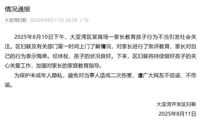 2025年8月10日下午,大亞灣區(qū)某商場內(nèi)一家長教育孩子時(shí)行為不當(dāng),引發(fā)了社會關(guān)注。區(qū)婦聯(lián)及有關(guān)部門第一時(shí)間上門了解情況,并對該家長進(jìn)行了批評教育,家長也對自己的行為表示后悔。經(jīng)體檢,孩子狀況良好。接下來,區(qū)婦聯(lián)會持續(xù)做好對孩子的關(guān)心關(guān)愛工作,同時(shí)加強(qiáng)對家長的家庭教育指導(dǎo)。