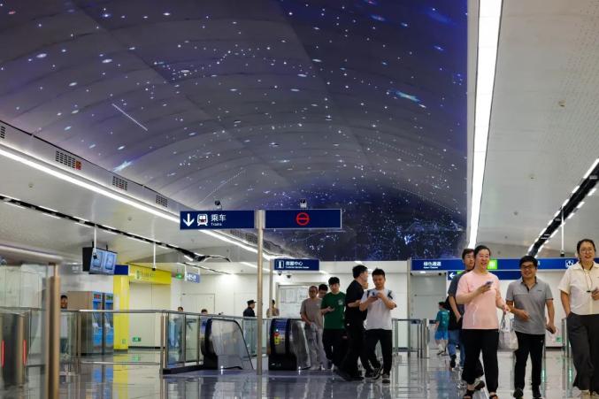 5號線虹橋站的“星空穹頂”也迅速成為網(wǎng)紅打卡點。南京市民張先生從小紅書上刷到美照后,專程來打卡。他說:“出靜海寺站后,步行10多分鐘就能到閱江樓、靜海寺和天妃宮,十分愜意。”