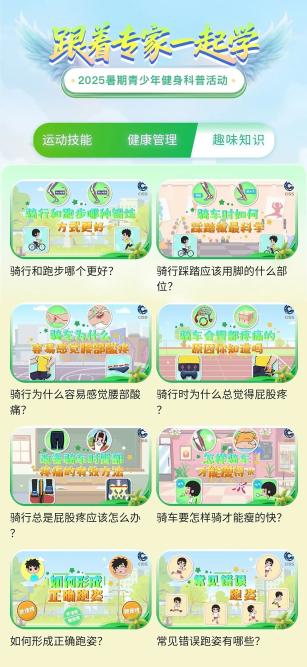 擔心運動方法不正確?活動中的“跟著專家一起學”環(huán)節(jié)就是你的貼心助手。這里涵蓋運動技能、健康管理、趣味知識三大類別,每日更新精選科普視頻。從運動前的準備動作、跑步技巧,到近視防控、脊柱健康等知識,還有“天天跑步好還是隔天跑步好”“騎車要怎樣騎才能瘦下去”等同學們關心的問題,專家都會給出專業(yè)解答。完整觀看視頻可獲得積分,轉發(fā)分享還能額外加分,輕松積累健康知識。