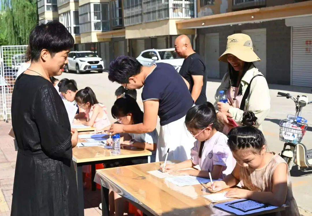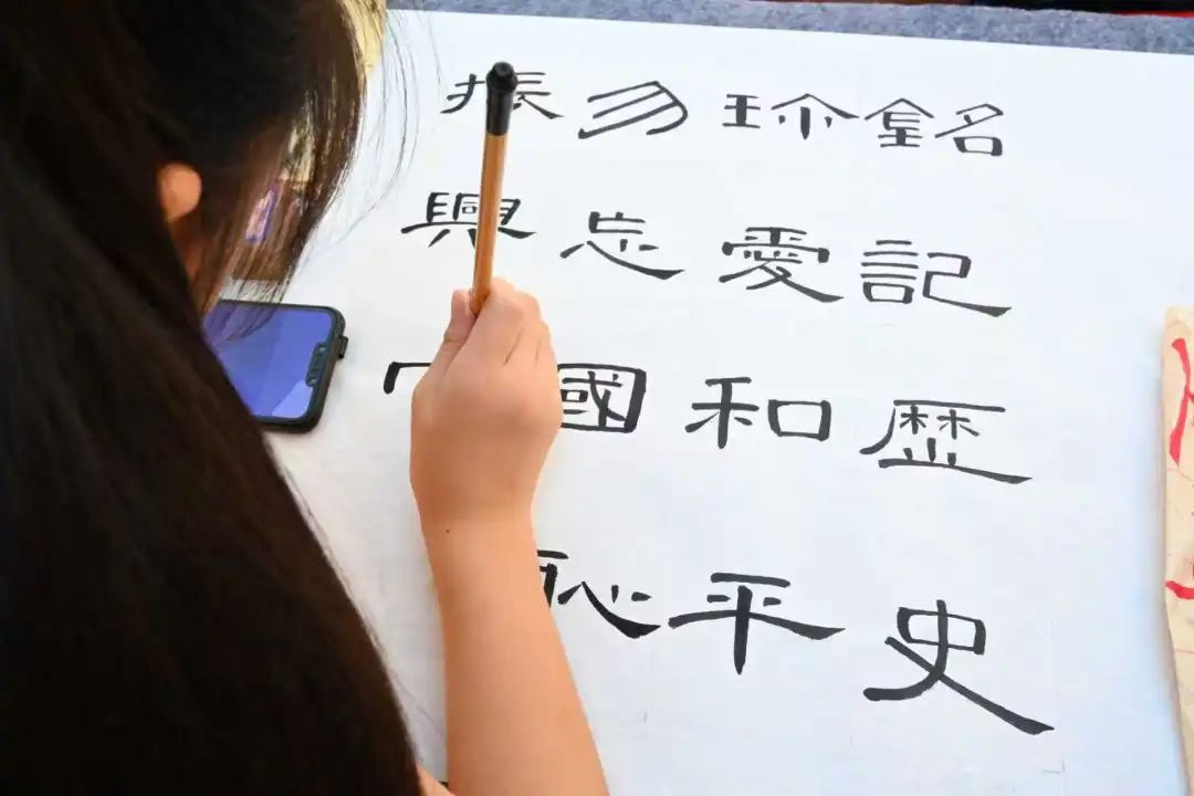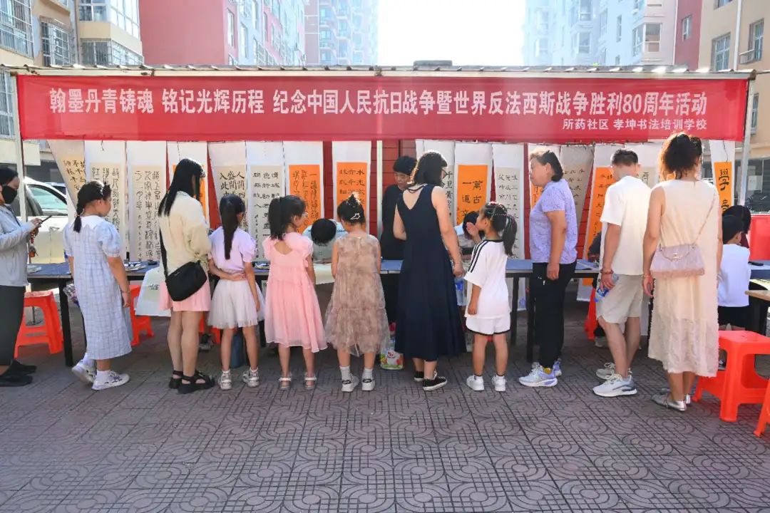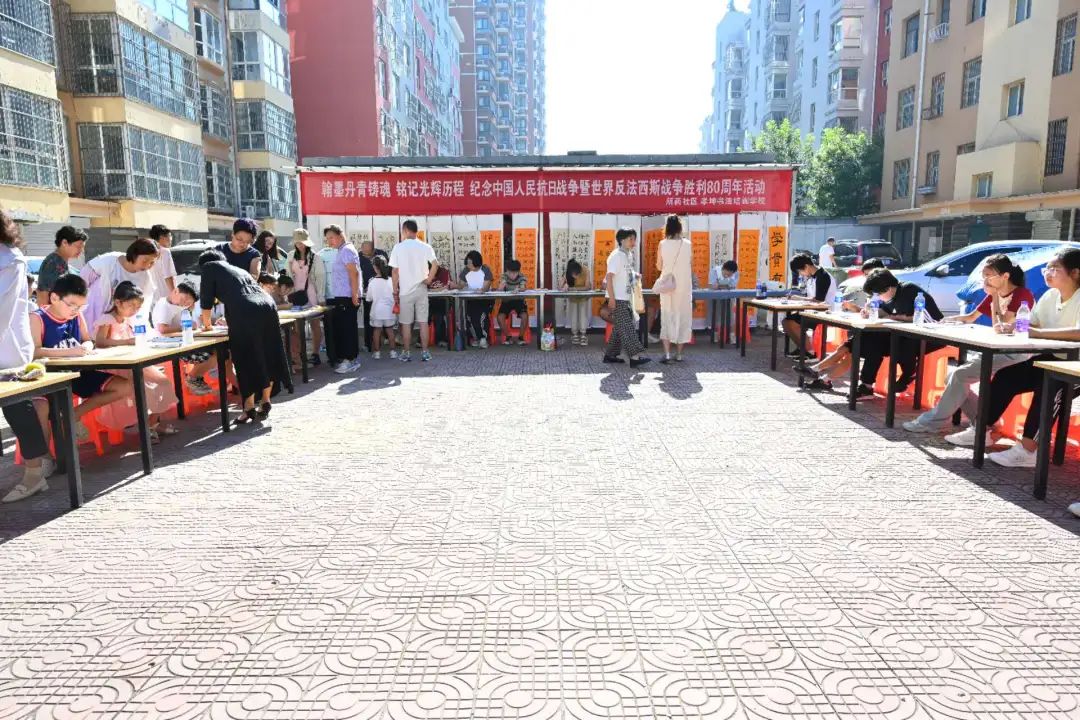 在陽光照耀下,一幅幅精美的書畫作品整齊地陳列著,吸引了眾多居民駐足欣賞。小學(xué)員們圍坐在長桌旁,專心致志地進行書法創(chuàng)作,他們以詩詞、警句等形式,抒發(fā)著對抗戰(zhàn)先烈的崇敬之情。這些作品生動展現(xiàn)了中國人民在抗日戰(zhàn)爭中不屈不撓的精神風(fēng)貌和偉大的民族氣節(jié),讓更多人在藝術(shù)創(chuàng)作中銘記歷史,汲取奮進的力量?;顒蝇F(xiàn)場,不少家長帶著孩子一同觀展,通過一幅幅作品,向孩子講述那段不容忘卻的歷史,讓紅色基因在下一代心中生根發(fā)芽。