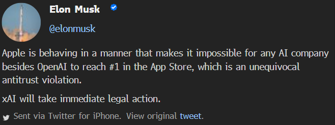 馬斯克在聲明中稱(chēng):“蘋(píng)果的做法使得除OpenAI外的任何AI公司都不可能在其應(yīng)用商店排名第一,這顯然構(gòu)成了壟斷違規(guī)行為?!彼€宣布旗下人工智能公司xAI將“立刻采取法律行動(dòng)”來(lái)解決這一問(wèn)題。