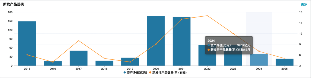 申萬(wàn)菱信的新發(fā)產(chǎn)品規(guī)模和數(shù)量都在下降。2021年,新發(fā)產(chǎn)品漲至16只,但規(guī)模較前一年略有下滑;2022年,新發(fā)產(chǎn)品數(shù)量增至17只,但規(guī)模不到70億元;2023年,新發(fā)規(guī)模平穩(wěn),但數(shù)量降至12只;去年新發(fā)產(chǎn)品規(guī)模和數(shù)量大幅下降,分別為39.17億元和7只;今年上半年,發(fā)行了5只產(chǎn)品,規(guī)模23.02億元。