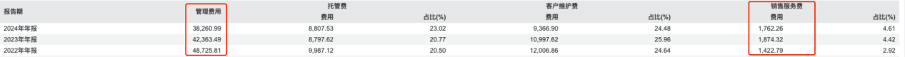 申萬(wàn)菱信的管理費(fèi)用已連續(xù)3年下降,從2022年的4.87億元降至去年的3.83億元。不過(guò)營(yíng)銷服務(wù)費(fèi)占比逐年增長(zhǎng),從2022年的2.92%增至去年的4.61%;去年1762.26萬(wàn)元的銷售服務(wù)費(fèi)用金額雖較2023年的1874.32萬(wàn)元有所下降,但較2022年的1422.79萬(wàn)元仍有不小的增幅。