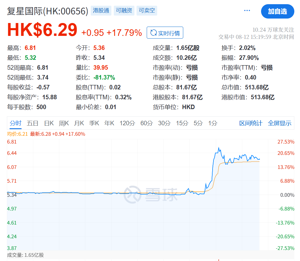 8月12日,復(fù)星國際盤中直線暴漲約20%。