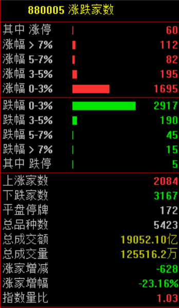 全市場中,2084只個股上漲,60只個股漲停,3167只個股下跌。
