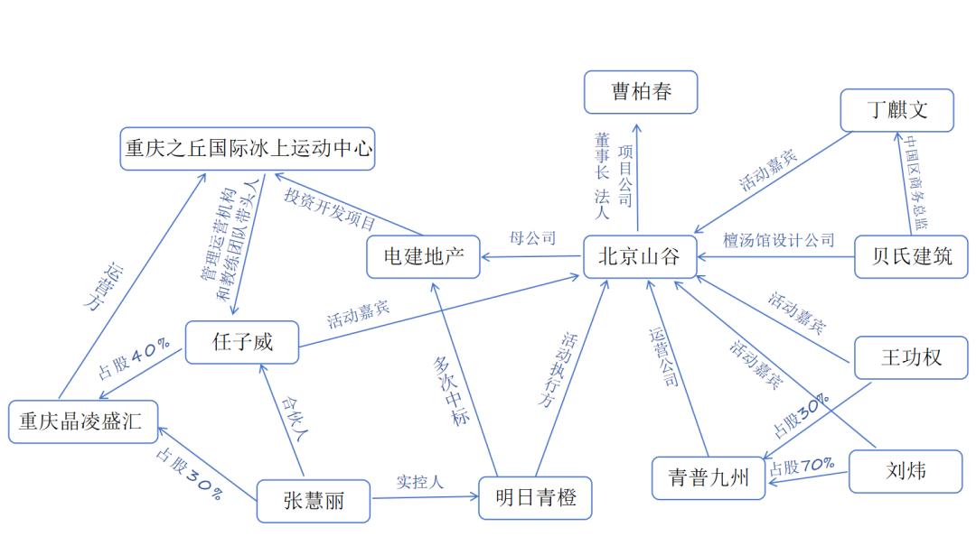 貝氏建筑是北京山谷?青普既來(lái)酒店?檀湯館的設(shè)計(jì)方,檀湯館是暴雨中積水較嚴(yán)重的建筑,今年1月開(kāi)業(yè)?,F(xiàn)場(chǎng)嘉賓任子威與電建地產(chǎn)往來(lái)頻繁,他是電建地產(chǎn)重慶冰雪項(xiàng)目——重慶之丘冰上運(yùn)動(dòng)中心的“冰雪推薦大使”,還掛帥教練團(tuán)隊(duì)。任子威任大股東的重慶晶凌盛匯體育文化發(fā)展有限公司是重慶之丘冰上運(yùn)動(dòng)中心的運(yùn)營(yíng)方。任子威在該公司占股40%為最大股東,第二大股東張慧麗占股30%。張慧麗控股北京明日青橙傳媒有限公司,占股80.6338%,而北京明日青橙正是此次北京山谷雨中發(fā)布會(huì)的活動(dòng)執(zhí)行方。電建地產(chǎn)一年多來(lái)的大型活動(dòng),如重慶之丘冰上運(yùn)動(dòng)中心開(kāi)幕式、“電音節(jié)”品牌活動(dòng)等,均由其執(zhí)行。