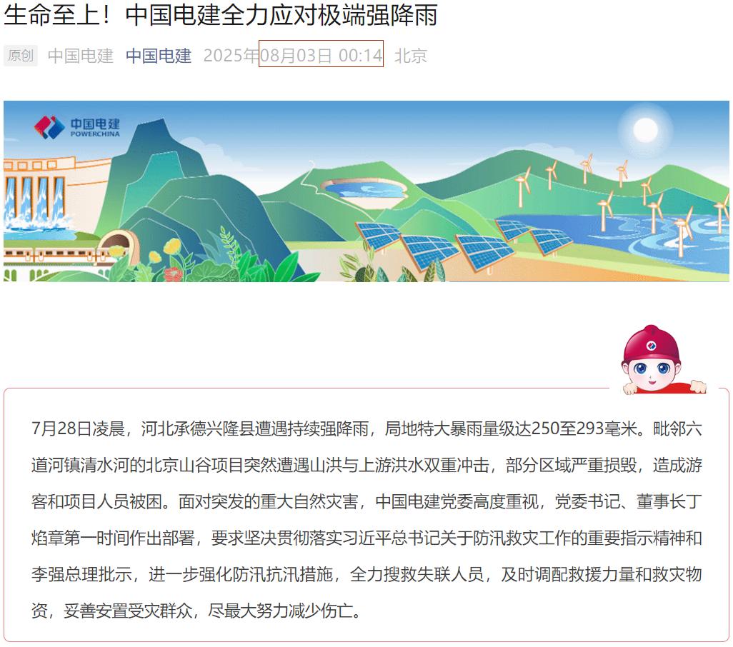 電建地產(chǎn)起初未對(duì)事件進(jìn)行官方回復(fù)。在新華社公布遇難、失聯(lián)人數(shù)的第二天,即事情發(fā)生6天后,中國(guó)電建凌晨在官方微信公眾號(hào)發(fā)文《生命至上!中國(guó)電建全力應(yīng)對(duì)極端強(qiáng)降雨》,文中只提積極救援,未涉及項(xiàng)目活動(dòng)、遇難者及善后安排。