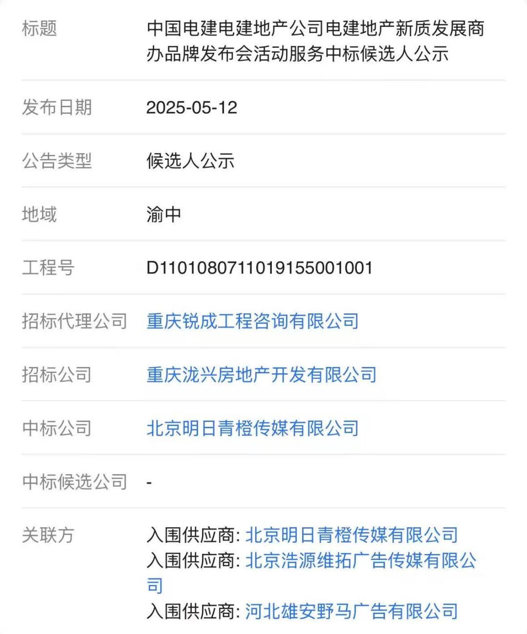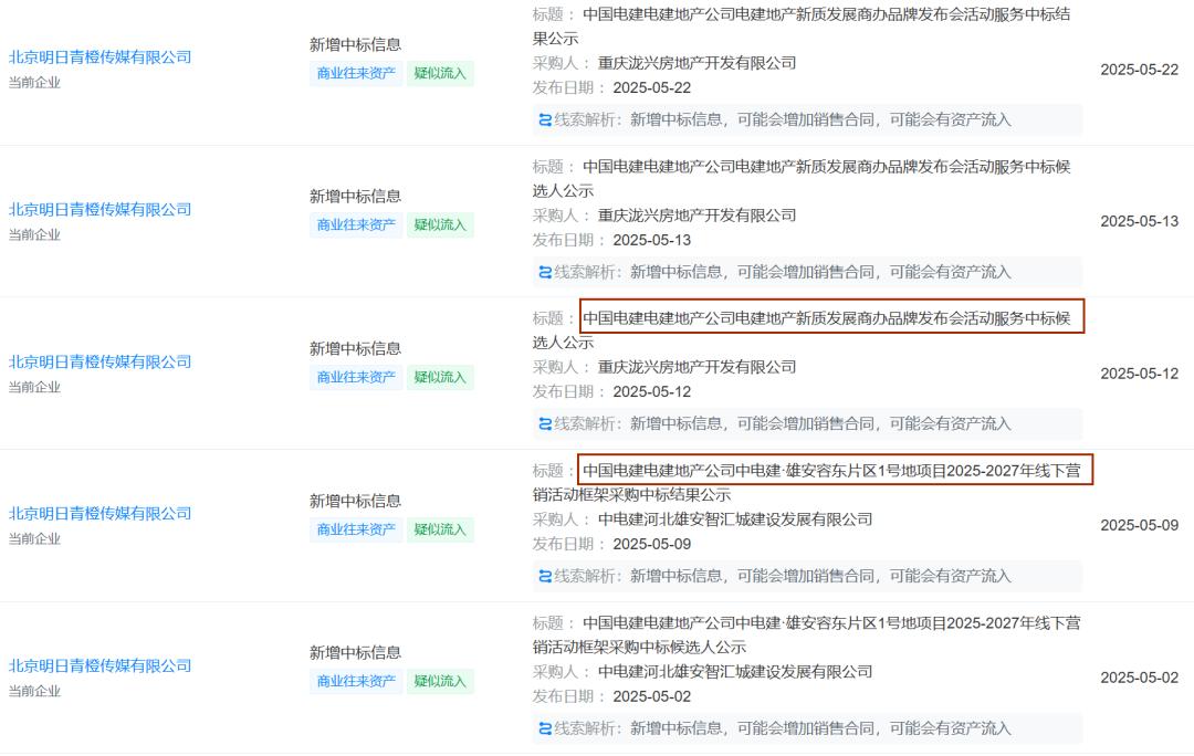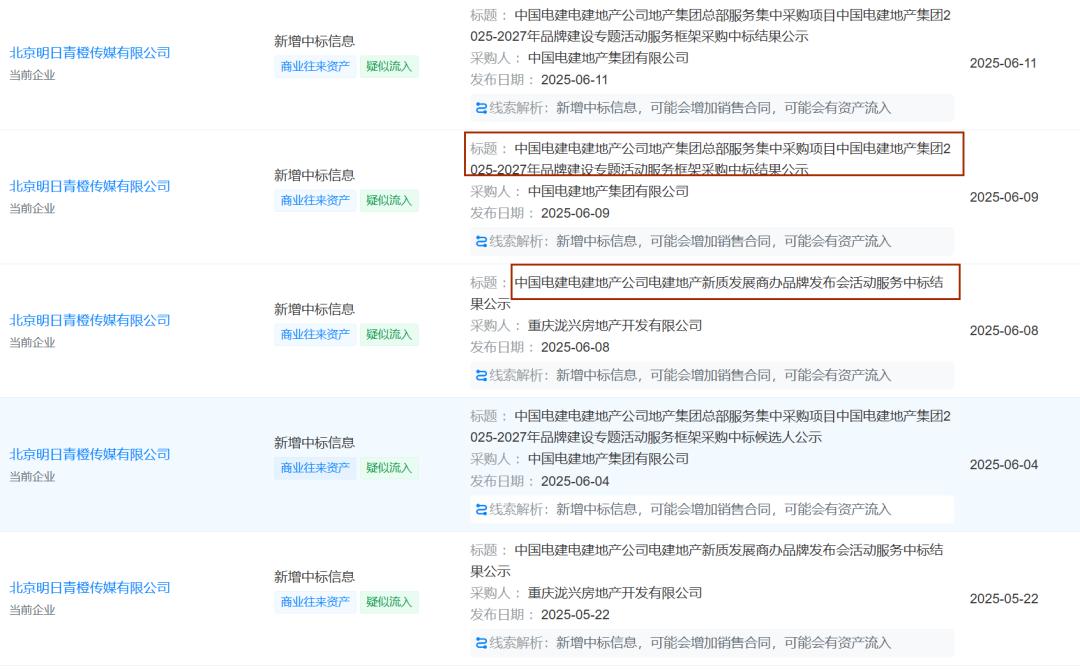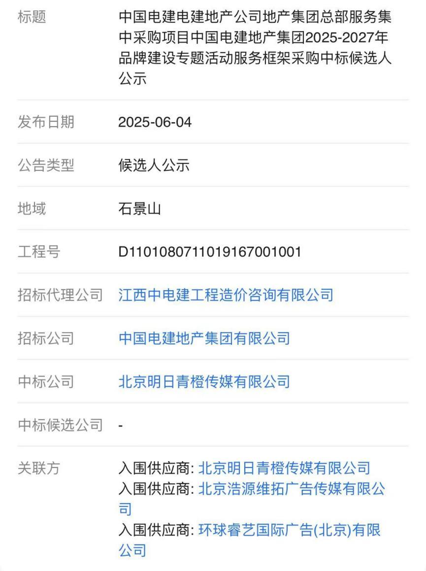 工商注冊(cè)信息顯示,北京明日青橙2024年6月12日成立,3個(gè)月后中標(biāo)2024年電建地產(chǎn)“電音節(jié)”品牌活動(dòng),中標(biāo)金額約299.7萬(wàn)元。通過(guò)中國(guó)電建陽(yáng)光采購(gòu)網(wǎng)查詢,電建地產(chǎn)6月至今“活動(dòng)”類(lèi)項(xiàng)目中標(biāo)結(jié)果只有“地產(chǎn)集團(tuán)總部服務(wù)集中采購(gòu)項(xiàng)目中國(guó)電建地產(chǎn)集團(tuán)2025 - 2027年品牌建設(shè)專(zhuān)題活動(dòng)服務(wù)框架”,中標(biāo)公司為北京明日青橙傳媒有限公司,這意味著電建地產(chǎn)所有品牌活動(dòng)都由其執(zhí)行。