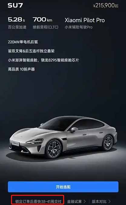 有網(wǎng)友猜測(cè),這或許是小米清理“黃?!倍谟唵蔚囊环N方式,此次被要求提前支付尾款的主要是小米SU7和SU7 Ultra的準(zhǔn)車(chē)主。值得留意的是,目前小米SU7的排產(chǎn)周期長(zhǎng)達(dá)38 - 41周,如果車(chē)輛生產(chǎn)出來(lái)后準(zhǔn)車(chē)主又改變主意,將會(huì)影響對(duì)其他訂車(chē)用戶(hù)的正常交付。