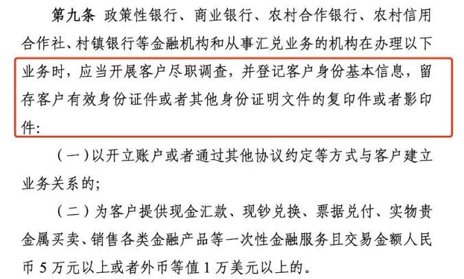 此外,為客戶提供現(xiàn)金匯款、實(shí)物貴金屬買賣等業(yè)務(wù),一次性交易金額超過5萬元的,金融機(jī)構(gòu)仍需開展盡職調(diào)查,并登記客戶身份基本信息,留存客戶有效身份證件或者其他身份證明文件的復(fù)印件或者影印件。