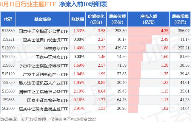 當(dāng)日,有126只行業(yè)主題ETF基金出現(xiàn)資金凈流入。其中,國(guó)泰中證全指證券公司ETF(512880)凈流入額居首,其份額增加了3.58億份,凈流入額達(dá)4.35億元。